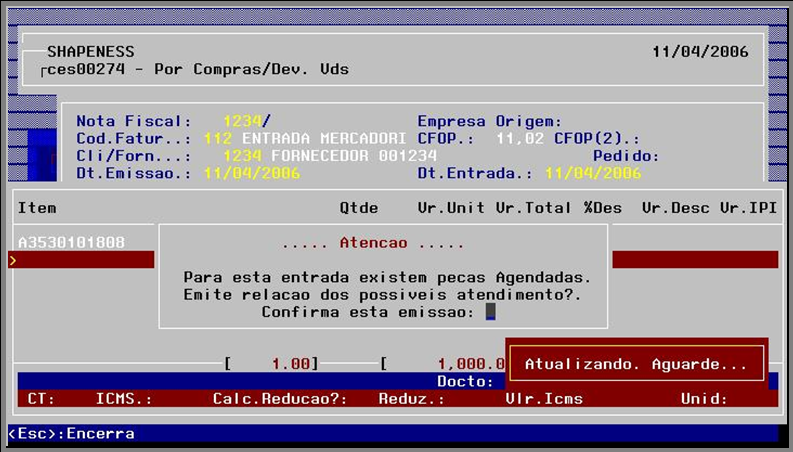 Quando o produto agendado chegar na empresa, logo após a digitação desta nota através do setor de peças, o sistema informará a este usuário de que existem peças agendadas possíveis de atendimento e dará a opção da listagem destas peças, informando seu código, nome do cliente, telefone, etc....Veja tela abaixo :