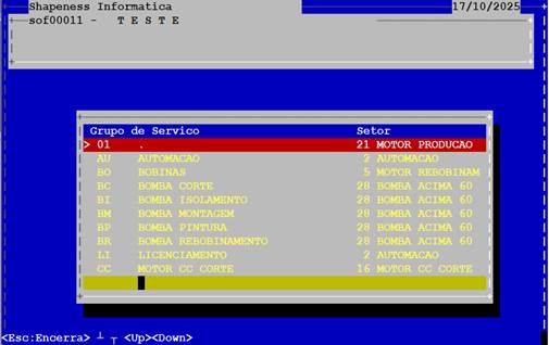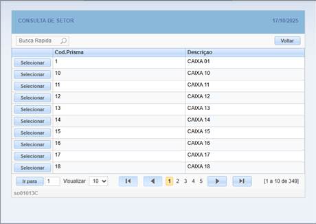 No sistema anterior, o acionamento da tecla F4 exibia uma lista detalhada contendo o código, a descrição e o setor correspondente: