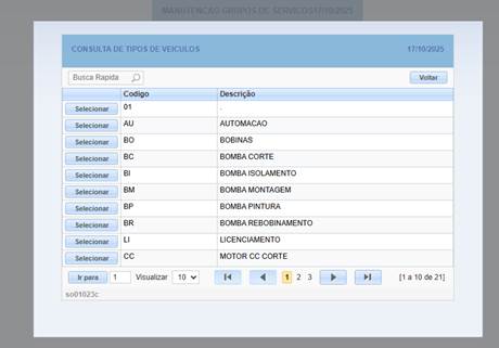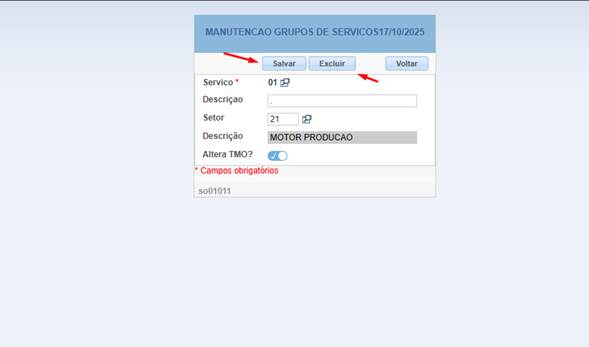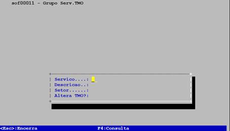 Serviço > Oficina > Tabelas Gerais > Oficina > Grupo Serv.TMO(sof00011)