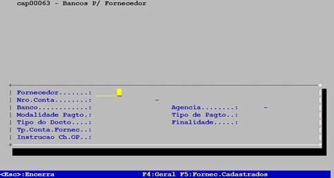 A interface do programa: Bancos p/Fornecedor (código: cap00063) foi totalmente redesenhada. As funcionalidades permanecem as mesmas, alterando apenas a forma de interação com os campos e botões.