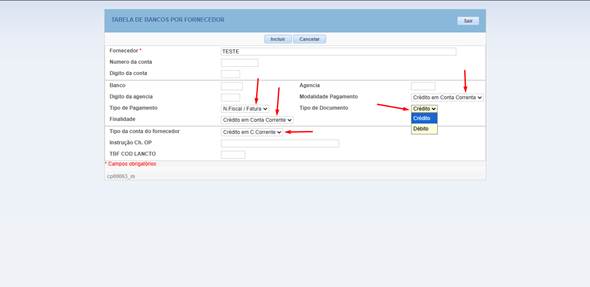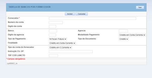 Financeiro > Contas a Pagar > Pagfor > Tabelas de Bancos Por Fornecedor (cap00063)