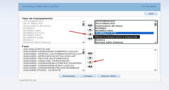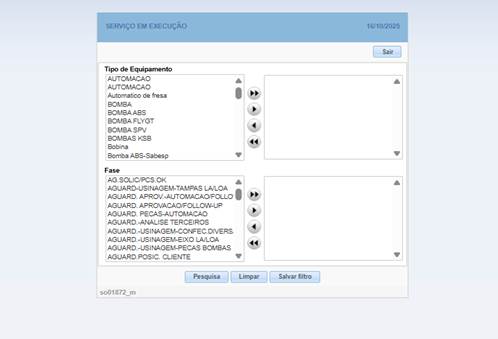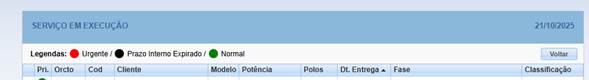 Após pesquisar o Tipo de Equipamento e a Fase, a lista de resultados será exibida. Cada equipamento listado apresentará uma legenda e uma cor para indicar seu status atual, que pode ser: