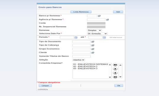 A interface do programa: Envio para Bancos (código: car00082 ) foi totalmente redesenhada. As funcionalidades permanecem as mesmas, alterando apenas a forma de interação com os campos e botões.