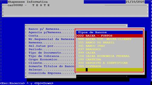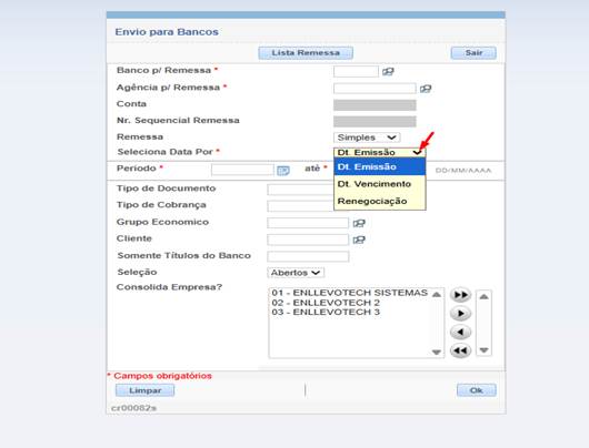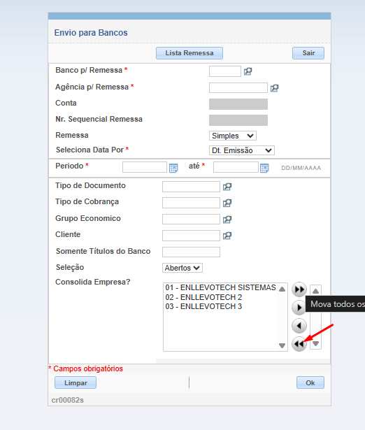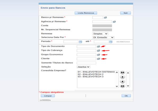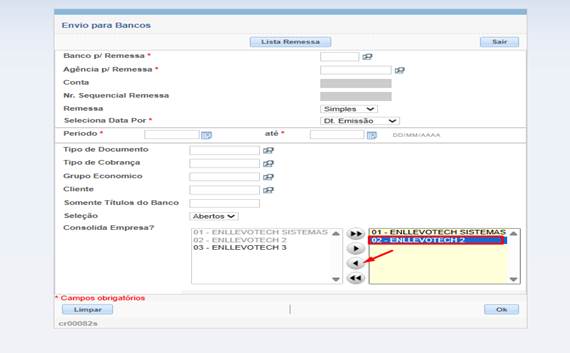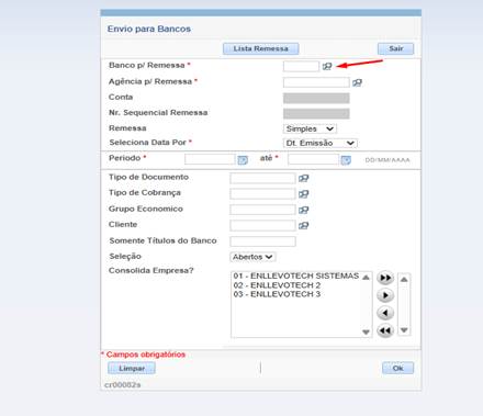 Financeiro > Contas a Receber > Movimentações > Envio para Bancos(car00082):