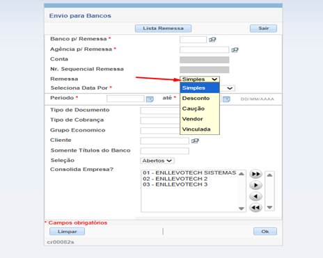 Para Selecionar o tipo de Remessa clique na opção “Simples” para abrir as outras opções: