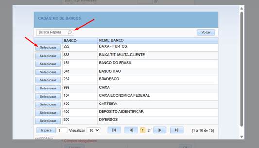 - Utilize o campo "Busca Rápida" (localizado logo acima da lista) para pesquisar por código ou descrição do banco. Basta digitar o termo e a lista será filtrada automaticamente.