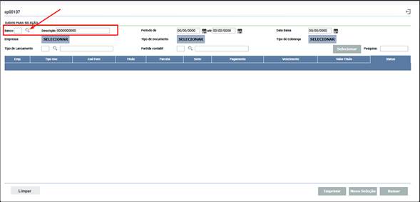 Para pesquisar e selecionar Bancos, clique no ícone de lupa (?) localizado à direita do campo.