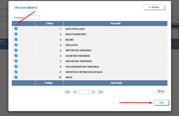 - Seleção de TODOS: Para marcar todos os Tipos de Documento da lista, localize o cabeçalho "Código" e clique na caixa de seleção ao lado dele.