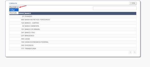 Isso abrirá a tela de consulta, onde será exibida a lista completa. Nesta tela, é possível realizar buscas por Descrição ou Código do Banco.