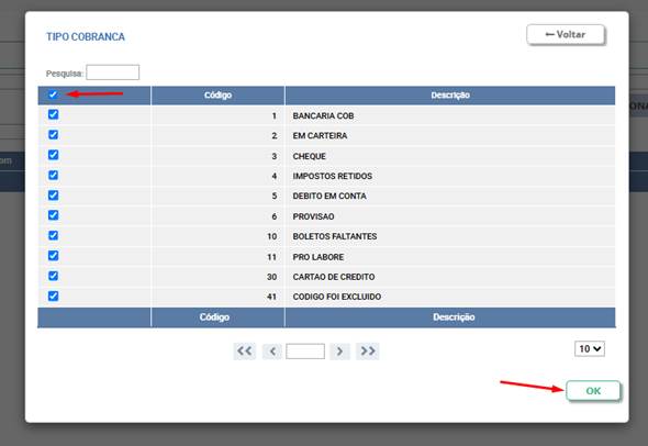 - Seleção de TODOS: Para marcar todos os Tipos de Cobrança da lista, localize o cabeçalho "Código" e clique na caixa de seleção ao lado dele.
