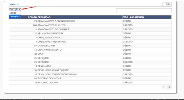 Isso abrirá a tela de consulta, onde será exibida a lista completa. Nesta tela, é possível realizar buscas por Descrição ou Código.