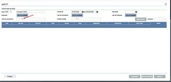Para pesquisar Tipo de Lançamento, clique no ícone de lupa (?) localizado à direita do campo.