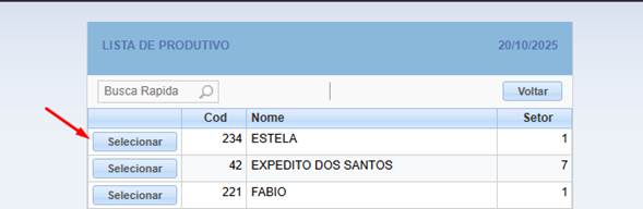 A tela de consulta exibe códigos, nomes e setores, e inclui uma pesquisa rápida. O grande diferencial é o botão "Selecionar" (à esquerda do código): clique nele para preencher o campo e retornar à pesquisa anterior automaticamente, eliminando a necessidade de digitar códigos manualmente.