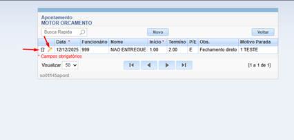 Irá aparecer data, código do funcionário, nome, início, termino, P/E, observação e o motivo parada, caso queria editar ou apagar basta clicar na lixeira para excluir ou no lápis para editar: