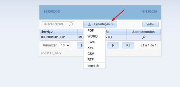 Se quiser exportar ou imprimir basta clicar no botão exportação e selecionar a opção que deseja a exportação seja: “DF, WORD, EXCEL,XML, CSV, RTF e Imprimir“: