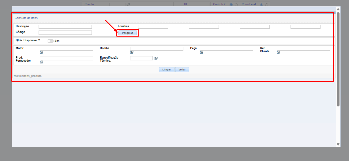 Ao clicar no ícone de lupa (?) ao lado do campo de item, o sistema abrirá a tela "Consulta de Itens". Esta tela centraliza diversas opções de filtro para facilitar sua busca: