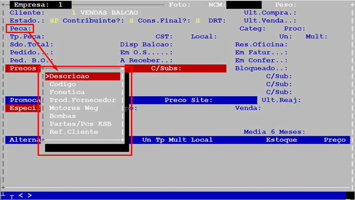 Na Interface Antiga para exibir as opções de filtro da peça, o usuário precisava pressionar a tecla F4. Isso abria um painel que continha as seguintes opções de consulta: