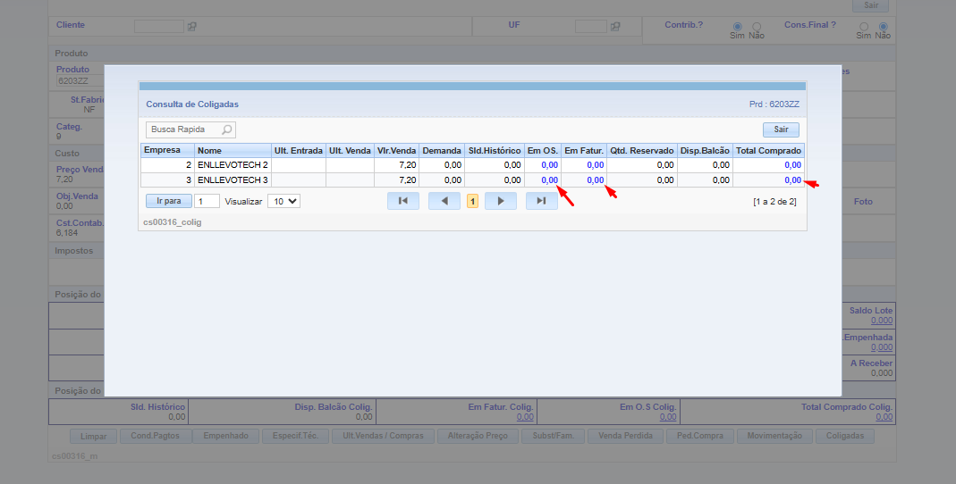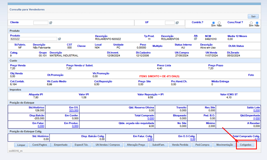 Exibe a consulta de Coligadas, onde tem o numero da impressa, valor de venda, demanda, Histórico, Valor em O.S Valor total em Faturamento, Quant. Reservada, Dispo Balcão, e total comprado, alguns campos em azul é possível clicar para verificar e consultar cada um: