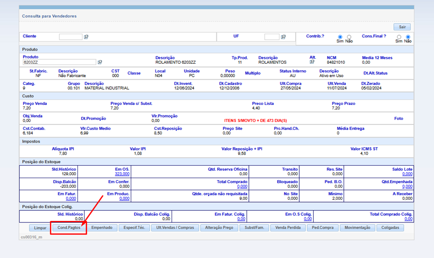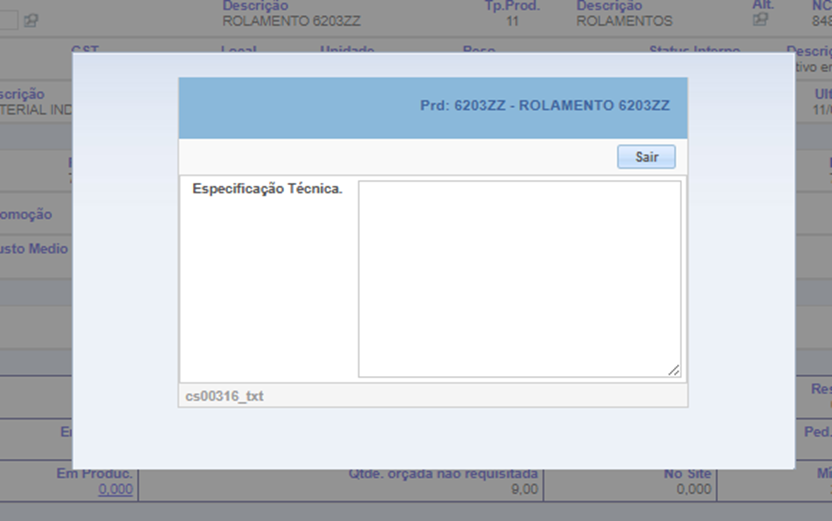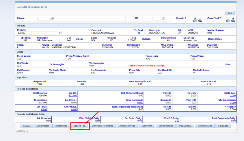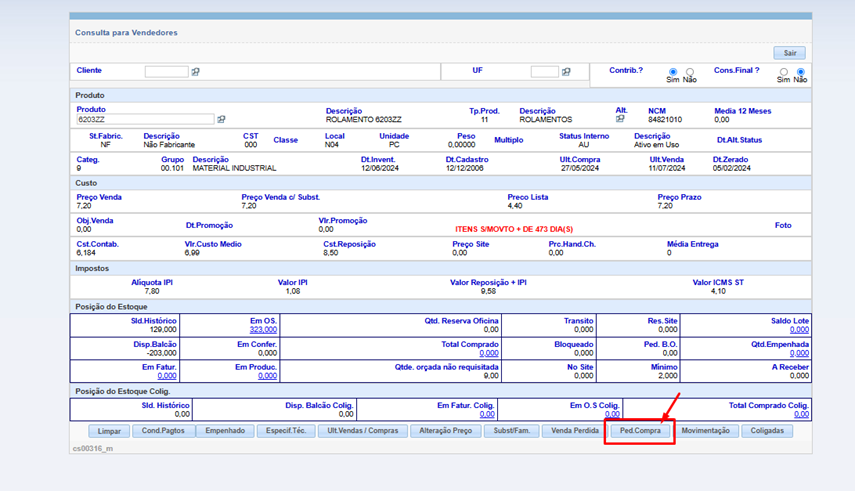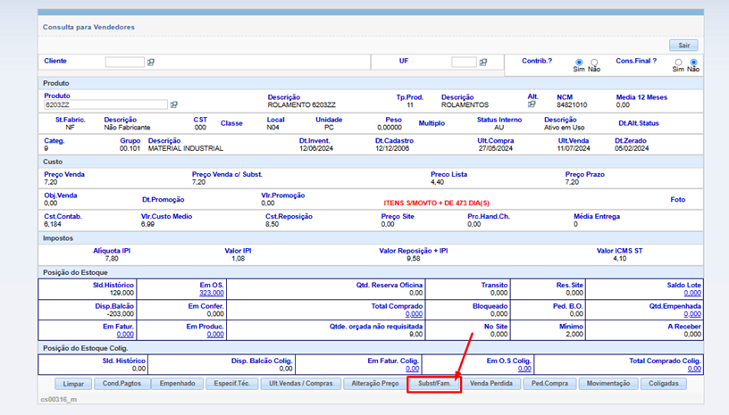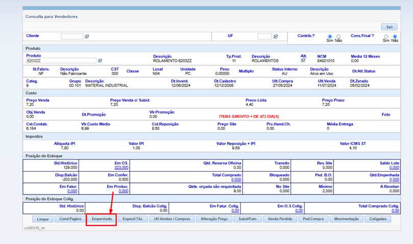 Os campos clicáveis após a busca do código do produto permitem consultar detalhes como: Valor Em O.S, Valor Total em Produção, Valor em Faturamento, Valor Total Comprado, Saldo lote, Qnt Empenhada, Em Fatur. Colig, Em O.S colig, Total comprado colig: