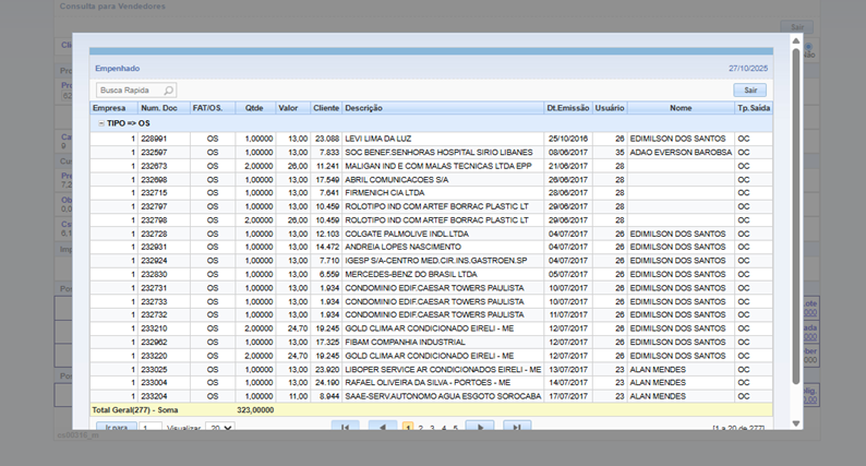 Exibe a lista de todos empenhados com as informações como datas, quantidades, valores, clientes, empresas, tipo saída: