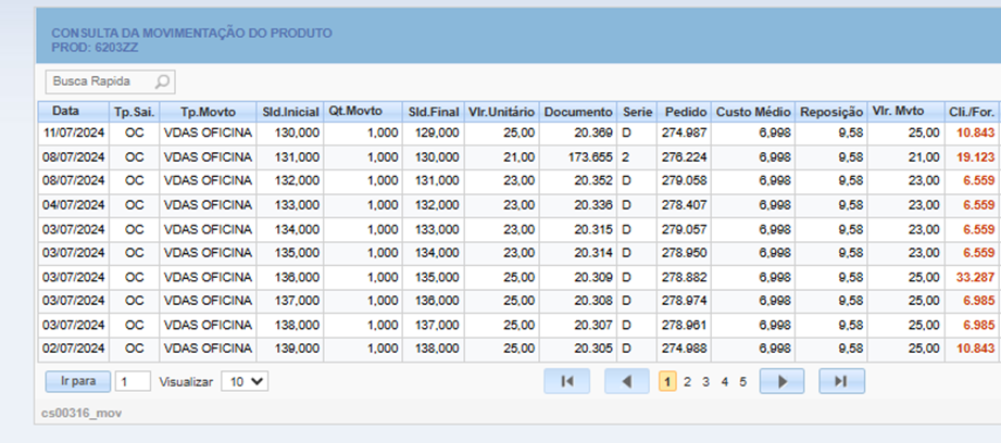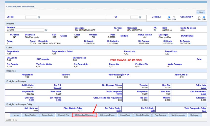 Exibe as informações como código do Item, valor da venda, último pedido, Data da última venda:
