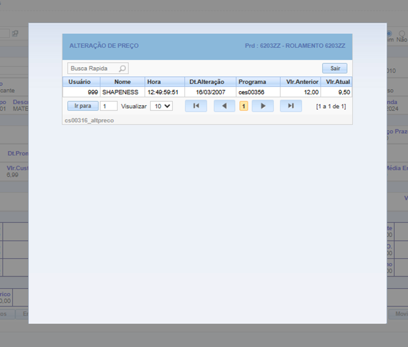 Exibe as informações das alterações de preço como: usuário, nome, data, hora, qual programa utilizou, valor anterior, valor atual: