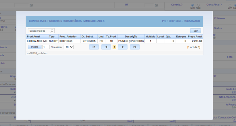 Exibe informações sobre os itens/produtos substituídos ou familiaridades: