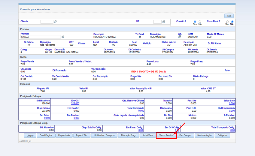 Caso queira incluir uma venda perdida do produto clique no botão “Venda Perdida”: