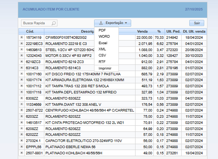 Os dados podem ser exportados diretamente para os formatos PDF, Word, Excel, XML, CSV, e RTF. Ao clicar no botão 'Exportação', as opções disponíveis serão exibidas.
