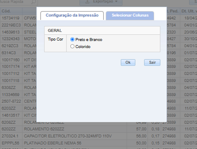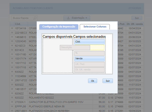 Todas as opções de exibição são configuráveis, permitindo a modificação e movimentação das colunas, bem como a personalização do layout de impressão para atender a requisitos específicos: