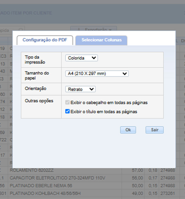 Configuração da Opção PDF, possível trocar o tamanho da folha, orientação,
