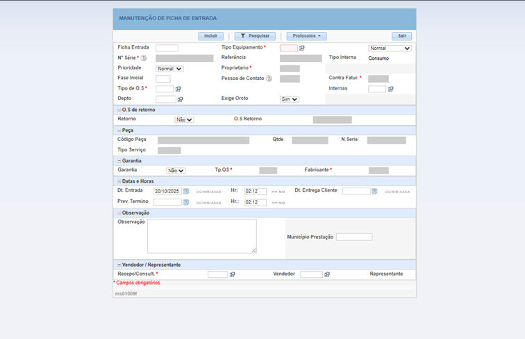 Serviços > Oficina > Recepção > Orçamento/O.S > Abertura Orçamento (mcs00009):