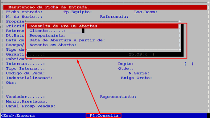 Na Interface Antiga para exibir as opções de filtro, o usuário precisava pressionar a tecla F4. Isso abria um painel que continha as seguintes opções de consulta: