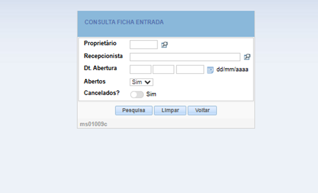- Nova Tela: O sistema exibirá a tela "Consulta Ficha de Entrada", que centraliza e organiza todas as opções de filtro para a consulta.