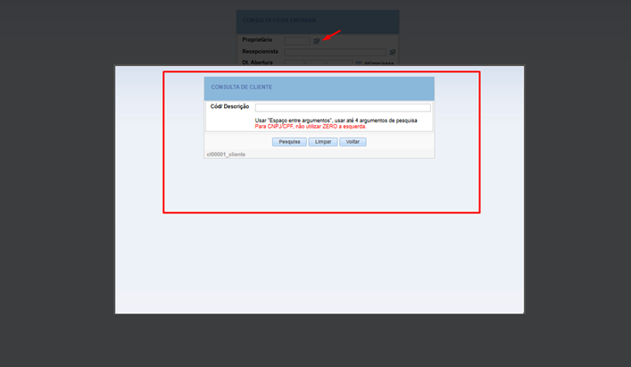 Exemplo Lupa Proprietário: Ao abrir a tela Consulta de Cliente, você tem duas opções para realizar a busca: