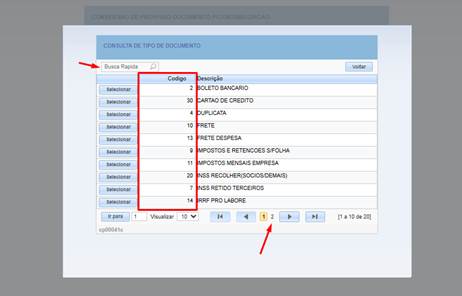 Caso você não saiba o código do tipo de documento, basta clicar no ícone de lupa (?) à direita do campo.
