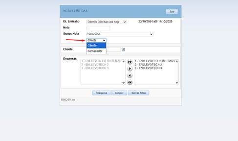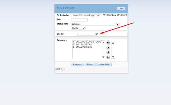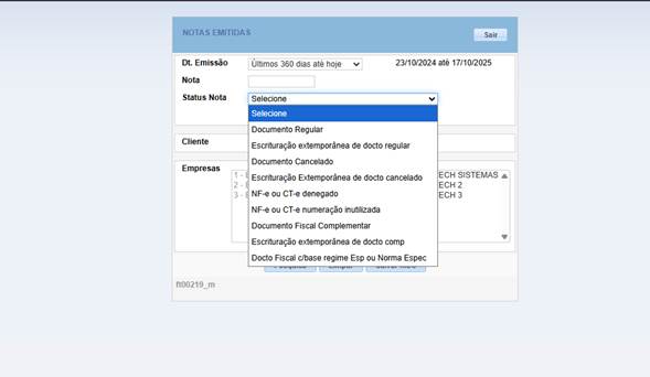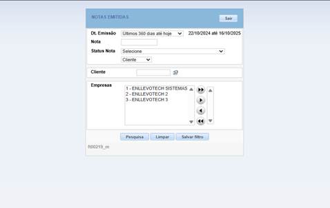 A interface do programa: NF Emitida Cli/for(código: fat00219) foi totalmente redesenhada. As funcionalidades permanecem as mesmas, alterando apenas a forma de interação com os campos e pesquisa.